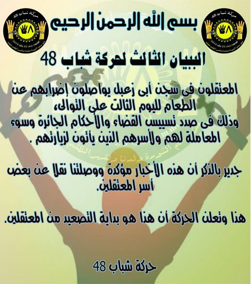 جاء ذلك في بيان لحركة شباب 48 بصفحتها الرسمية على موقع التواصل الاجتماعي "فيسبوك"، والتي نقلت معاناة المعتقلين بسجن أبوزعبل من أسرهم،  حيث أعلنت الحركة أن الإضراب يعد بداية التصعيد من المعتقلين.