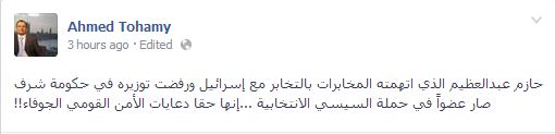 حيث قال تهامي في تدوينة له عبر صفحته الشخصية بموقع التواصل الاجتماعي "فيس بوك": "حازم عبد العظيم الذي اتهمته المخابرات بالتخابر مع إسرائيل ورفضت توزيره في حكومة شرف صار عضواً في حملة السيسي اﻻنتخابية" !!