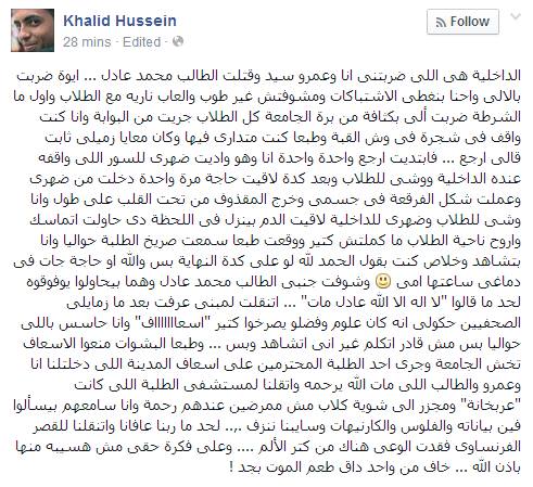 وقد روى خالد تفاصيل ما حدث له على صفحته الشخصية بموقع التواصل الاجتماعي "فيس بوك" حيث قرر قائلا: "الداخلية هي من ضربت بالآلي وإحنا بنغطي الاشتباكات ومشوفتش غير طوب وألعاب نارية مع الطلاب، وأول ما الشرطة ضربت آلي بكثافة من برة الجامعة كل الطلاب جريت من البوابة وانا كنت واقف في شجرة في وش القبة، وطبعا كنت متداري فيها وكان معايا زميلي ثابت قال لي ارجع،  فابتديت أرجع واحدة واحدة أنا وهو، واديت ضهري للسور اللي واقفة عنده الداخلية ووشي للطلاب".