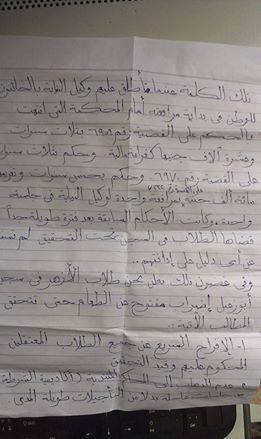 وفي غضون ذلك نعلن نحن طلاب الأزهر في سجن أبو زعبل إضرابًا مفتوح عن الطعام حتى تتحق المطالب الآتية:-