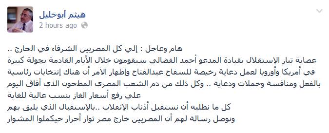 حذر الناشط السياسي والحقوقي هيثم أبو خليل المصريين في الخارج من خداع أعضاء تيار الاستقلال المصريين بأن هناك انتخابات رئاسية ومنافسة حقيقية، بحملات دعائية رخيصة، علي دماء الشعب المصري المطحون، والذي أفاق اليوم على رفع أسعار الغاز بشكل كبير – على حد قوله.