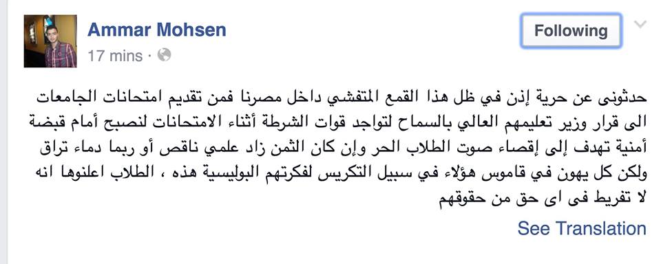 قال عمار محسن، رئيس اتحاد طلاب جامعة الزقازيق، أن الطلاب أصبحوا أمام قبضة أمنية تهدف إلى إقصاء صوتهم مهما كلف الانقلاب ذلك من ثمن سواء في مواد علمية ناقصة أو دماء طلاب تراق حتى يسكت صوت الطلاب.