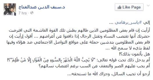 وجهه الدكتور سيف الدين عبد الفتاح أستاذ العلوم السياسية بجامعة القاهرة، رسالة إلي ياسر برهامي نائب رئيس الدعوة السلفية، متسائلا: هل قيام المظلومين الذين طالتهم قوة البطش الغاشمة بتدشين حملة إلكترونية ضد الظالمين بلفظ بذيء، والذي أكد برهامي في فتواة أنهم يغتصبون النساء ويقتلون الرجال حال دفاعهم عن عرضهم يأثمون بذلك، وهل يدخل استخدام اللفظ المسيء مقابل هذا الاذي في العرض تحت قوله تعالى: "لَا يُحِبُّ اللَّهُ الْجَهْرَ بِالسُّوءِ مِنَ الْقَوْلِ إِلَّا مَنْ ظُلِمَ"؟! ، أم يجب علي المظلومين الصبر والتعفف عن السب برغم اغتصاب نسائهم؟".