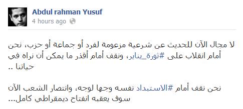 وأضاف يوسف عبر صفحته علي موقع التواصل الاجتماعي "فيسبوك" ، أنة لا مجال الآن للتحدث عن انتصارات شخصية لفرد أو جماعة أو حزب ، أو الحديث عن شرعية مزعومة لحزب أو جماعة أو شخص بعينة".