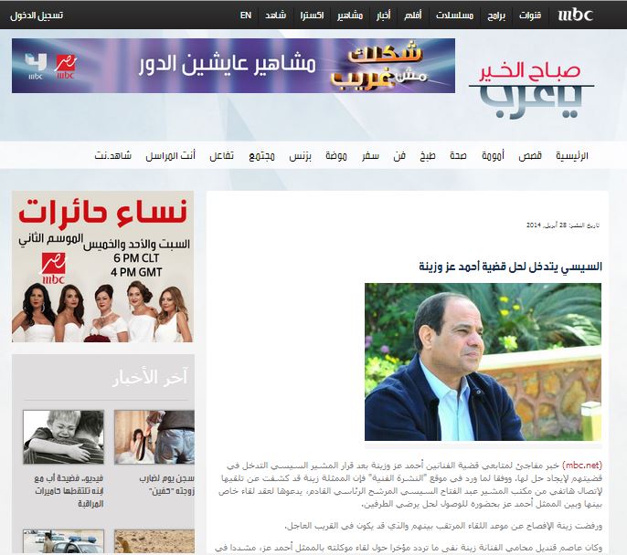 في خبر نشرته قناة mbc مصر في النشرة الفنية منذ قليل قالت القناة :"خبر مفاجئ لمتابعي قضية الفنانين أحمد عز وزينة بعد قرار المشير السيسي – قائد الانقلاب العسكري- التدخل في قضيتهم لإيجاد حل لها.