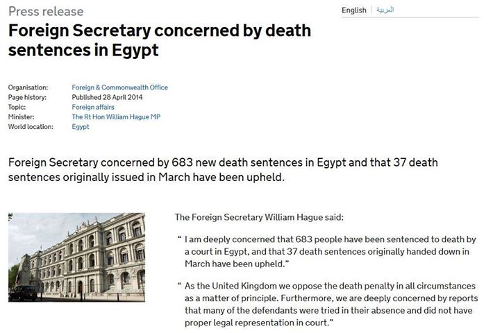 أبدت الخارجية البريطانية انزعاجها من حكم الإعدام علي مئات من معارضي الانقلاب وجاء في البيان الذي نشر منذ قليل علي صفحتها الرسمية علي لسان وليم هيج وزير الخارجية البريطاني:" أن المملكة المتحدة تبدي قلقها عن حكم الإعدام الذي صدر علي مئات من أنصار الرئيس المصري المعزول محمد مرسي".