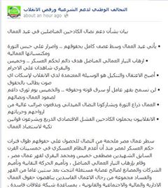 وأضاف التحالف أنة لن يسمح بقهر العمال أو سرقتة حقوقة وتشريدة ، داعيا إلي يوم ثوري لتحية ودعم صمود العمال ونضالهم الخميس المقبل ، في دعم منة لحقوقهم في حياة كريمة لهم ولأبنائهم ، ويعلوا صوت العمال في وجهه "حاميها حراميها " : لا وألف لا.