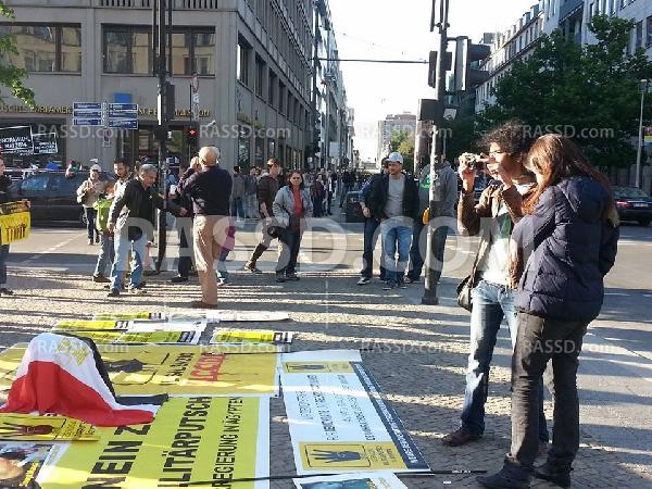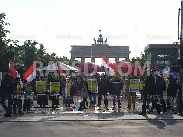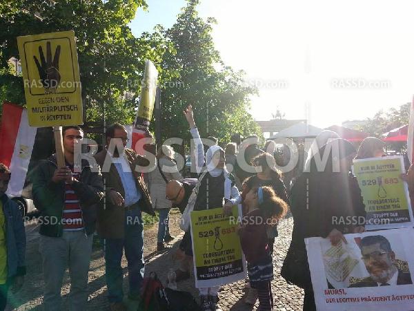 وتجمع المتظاهرون أمام المفوضية الأوربية ببرلين هاتفين شعارات مناهضة للعسكر وأحكام الإعدام الجائرة ضد ما يزيد على 1000 من رافضي الانقلاب بمصر رافعين شعارات رابعة العدوية.