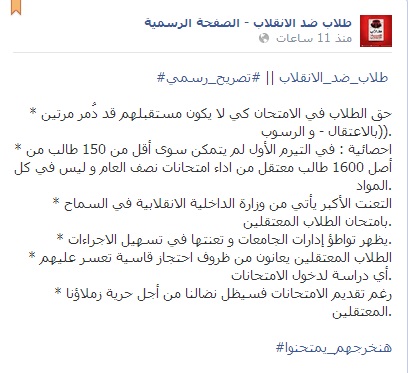 نشرت حركة "طلاب ضد الانقلاب" تصريحا عبر موقع التواصل الاجتماعي فيس بوك تطالب فيه بالسماح للطلاب المعتقلين بأداء امتحاناتهم "كي لا يدمر مستقبلهم مرتين باعتقالهم ورسوبهم".