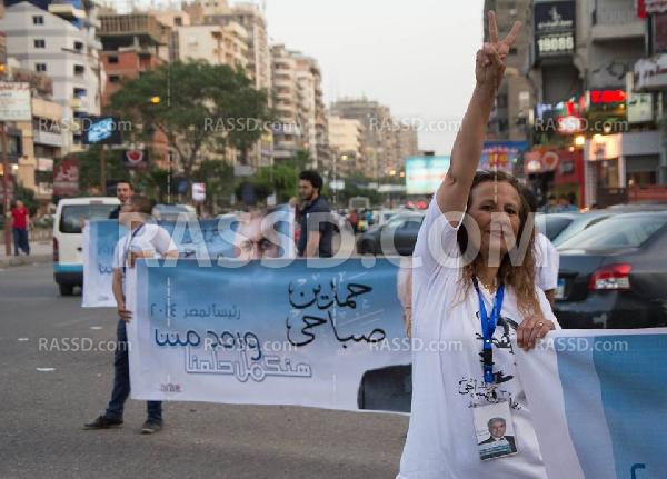 قام شباب من أنصار المرشح للرئاسة حمدين صباحي بتنظيم وقفة دعائية له بمدينة نصر حاملين صوره ولافتاته.