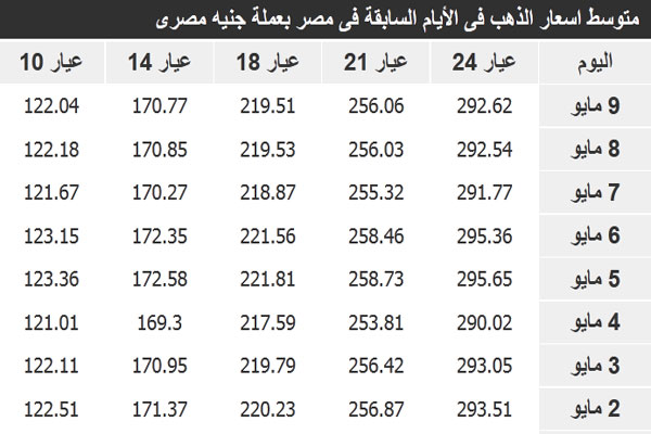 والجدول التالي يوضح أسعار الذهب خلال الأسبوع،بحسب"بوابة الأهرام".