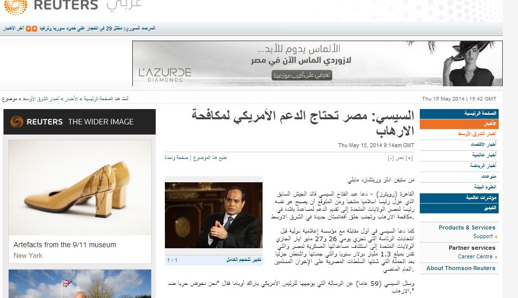 ناشد قائد الانقلاب العسكري عبد الفتاح السيسي في حوار مع وكالة رويترز العالمية،الولايات المتحدة إلى تقديم الدعم لمساعدته في مكافحة الإرهاب وتجنب خلق أفغانستان جديدة في الشرق الأوسط،- علي حد قوله-.