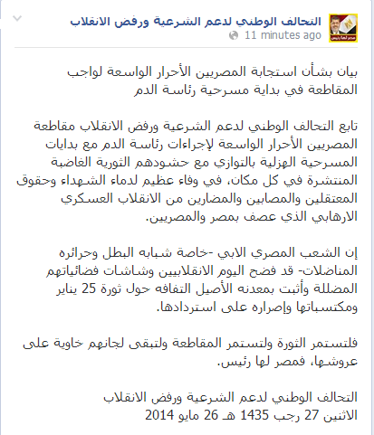 وجدد البيان دعوته لثوار مصر: "لتستمر الثورة ولتستمر المقاطعة ولتبقى لجانهم خاوية على عروشها، فمصر لها رئيس"