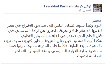 وتابع بالقول: "السيسي خسر بشكل واضح أول اختبار شعبية حقيقي بالأمس. على المحبطين إعادة النظر لأن المأمورية طلعت سهلة جداً" وحض وأكد الناخبين على النزول والمشاركة بالانتخابات، وأعرب عن مواصلة دعمه لصباحي بالقول: "اليوم يومك يا حمدين. انزل أكد إحنا مين."