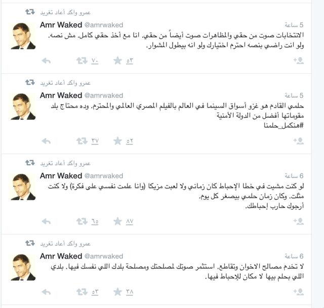أما الممثل المصري عمرو وأكد، المعروف بتأييده للمرشح حمدين صباحي، فقد تواصل مع متابعيه الذين يقاربون 1.5 مليون شخص طوال ساعات النهار، معلقا على "الإقبال الضعيف" في العديد من الأماكن بالقول "شعبية السيسي وهم صنعه الإحباط.. تخيل الإخوان هينفشوا ريشهم إزاي لو نسبة المشاركة طلعت متدنية. تدني النسبة مؤشر إنهم مؤثرين لسه وممكن يرجعوا."