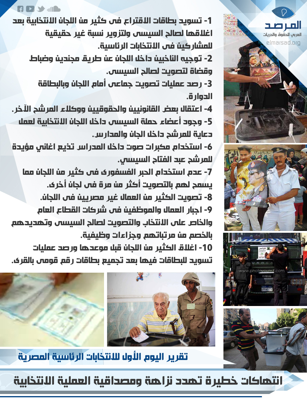 أصدر المركز العربي للحقوق والحريات تقريره عن اليوم الأول لانتخابات العسكر مشيرًا إلى أن هناك مخالفات خطيرة تهدد نزاهة الانتخابات .