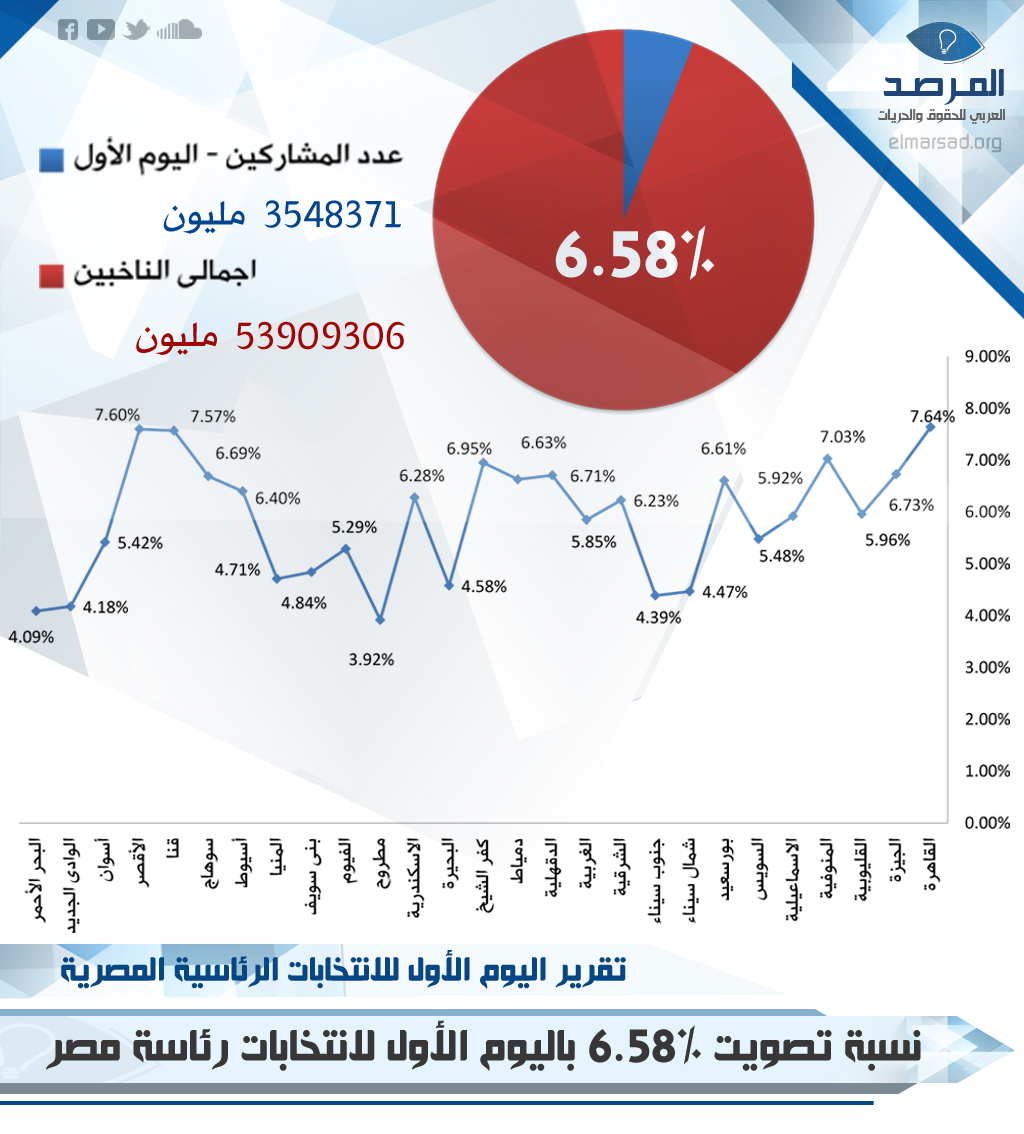 وقال المرصد إن نسبة المشاركة بلغت 3548371 ناخب من أصل ما يقارب 53 مليون ناخب، بنسبة مشاركة بلغت 6.58%.