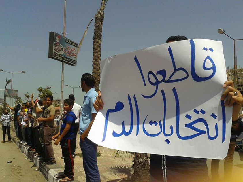 نظم التحالف الوطني لدعم الشرعية بمحافظة بورسعيد سلاسل بشرية رافضة للانقلاب، اليوم الثلاثاء، أمام كلية العلوم، تنديدا بانتخابات العسكر، في ثاني أيام التصويت.