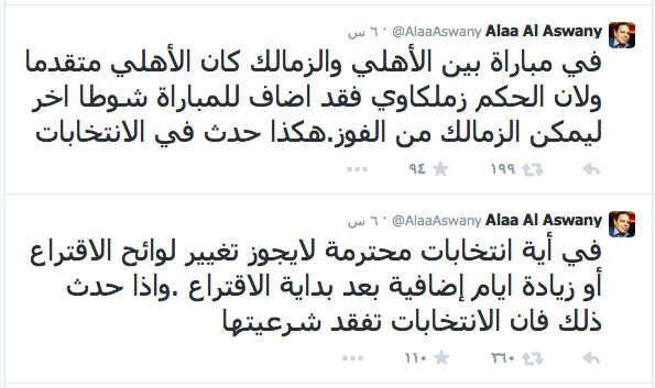وضرب الأسواني مثالًا عبر حسابه الشخصي على موقع التواصل الإجتماعي "تويتر" ، قائلًا "أنه لو كانت هناك مباراة بين الأهلى والزمالك وكان الأهلى متقدمًا، ولأن الحكم زملكاوى، فقد أضاف للمباراة شوطًا آخر ليمكن الزمالك من الفوز هكذا حدث فى الانتخابات.