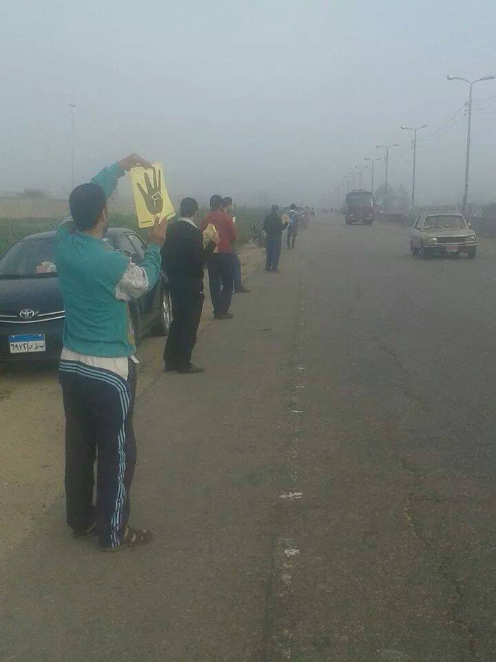 واطصف المشاركون على طريق مصر/ الإسكندرية الزراعي، رافعين شارات رابعة العدوية، وصور الرئيس محمد مرسي، وسط ترحاب من المارة وسائقي السيارات.
