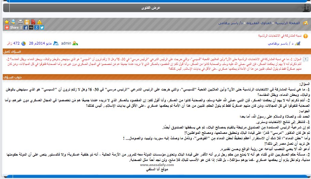 لم تكد تمر ساعات على إعلان نتيجة انتخابات العسكر، حتى أصدر ياسر برهامي، رئيس الدعوة السلفية، على الموقع الرسمي للدعوة، منذ قليل، فتوى جاءت عكس فتواه السابقة بجواز إسقاط الرئيس محمد مرسي، حيث قال فيها: "إن شرعية الرئيس المستمدة مِن الصندوق مرتبطة بالقيام بمصالح البلاد، ثم هي يسقطها الصندوق أيضًا".