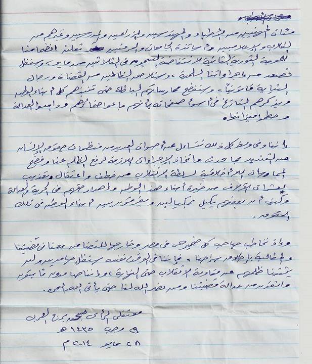 كما طالب المعتقلين المجتمع الدولي وشرفاء مصر، ووسائل الإعلام الحرة بتسليط الضوء علي قضيتهم المنسية، ودعمهم في معركة الأمعاء الخاوية.