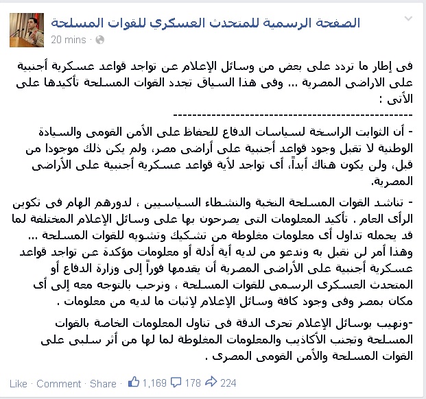 ودعا على "من لديه أية أدلة أو معلومات مؤكدة عن تواجد قواعد عسكرية أجنبية على الأراضى المصرية أن يقدمها فوراً إلى وزارة الدفاع أو المتحدث العسكرى الرسمى للقوات المسلحة ، ونرحب بالتوجه معه إلى أى مكان بمصر وفى وجود كافة وسائل الإعلام لإثبات ما لديه من معلومات" .
