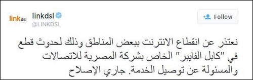وجهت شركة «لينك دي إس إل»، اعتذاراً عبر صفحتها الرسمية علي موقع التواصل الإجتماعي "تويتر" عن انقطاع الإنترنت ببعض المناطق في مصر بسبب قطع في «كابل الفايبر»، وذلك بعد تكرار الشكاوى على مواقع التواصل الاجتماعي .