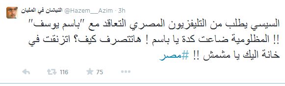 وأضاف عبد العظيم على حسابه الرسمي على "تويتر" الخميس: "السيسي يطلب من التليفزيون المصري التعاقد مع "باسم يوسف" !! المظلومية ضاعت كدة يا باسم ! هاتتصرف كيف؟ اتزنقت في خانة اليك يا مشمش".