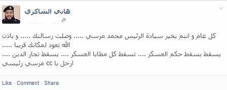 وقال "الشاكري" في تدوينة له عبر حسابه الرسمي على موقع التواصل الاجتماعي "الفيس بوك": "كل عام وأنتم بخير سيادة الرئيس محمد مرسي وصلت رسالتك وباذن الله تعود لمكانك قريباً يسقط يسقط حكم العسكر تسقط كل مطايا العسكر يسقط تجار الدين إرحل يا cc مرسي رئيسي".