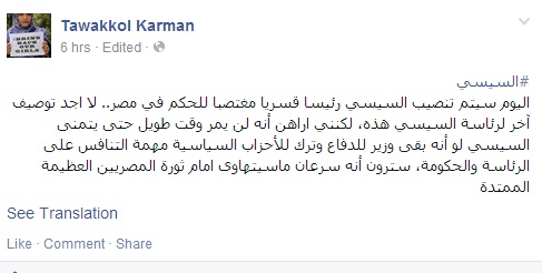 قالت توكل كرمان الناشطة اليمنية الحاصلة على جائزة نوبل للسلام، إنه "لن يمر وقت طويل حتى يتمنى السيسي لو أنه بقي وزيرا للدفاع، وترك للأحزاب السياسية مهمة التنافس على الرئاسة والحكومة".