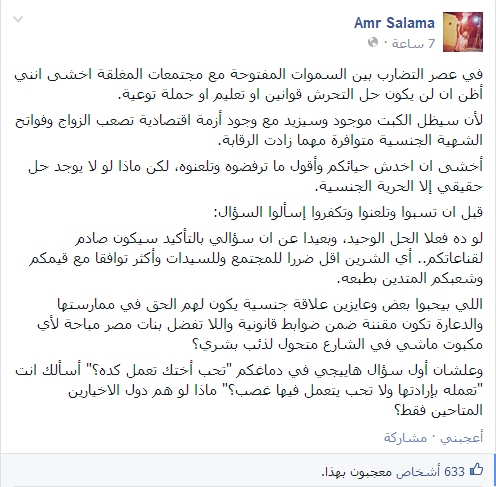 علق المخرج الشاب "عمرو سلامة" على واقعة التحرش التي وقعت بين مؤيدي قائد الانقلاب العسكري بالأمس أثناء احتفالهم بتنصيبه، في ميدان التحرير، وذلك في تدوينة نشرت على حسابه الشخصي على موقع التواصل الإجتماعي "فيس بوك "، حيث أكّد على أنّه لا يوجد حل حقيقي لأزمة التحرش، من وجهة نظره، إلا بـ"الحرية الجنسية"، وذلك من خلال تقنين البغاء، واصفاً ذلك بأنّه أقل ضررًا من التحرش.