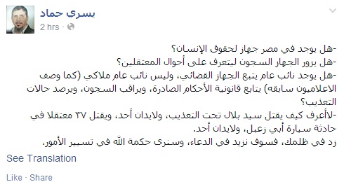 وتساءل :"هل يوجد في مصر جهاز لحقوق الإنسان؟، هل يزور الجهاز السجون ليتعرف على أحوال المعتقلين؟،هل يوجد نائب عام يتبع الجهاز القضائي، وليس نائب عام ملاكي (كما وصف الإعلاميون سابقه) يتابع قانونية الأحكام الصادرة، ويراقب السجون، ويرصد حالات التعذيب؟".