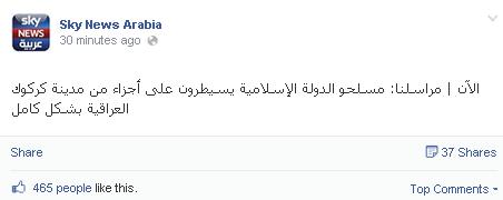 وقالت سكاي نيوز على حسابها الرسمي:"مسلحو الدولة الإسلامية يسيطرون على أجزاء من مدينة كركوك العراقية بشكل كامل".