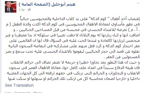 وقال أبو خليل عبر صفحته على "فيس بوك":إن والدة الطفل ( م . أ . م ) أكدت تعرضه للاعتداء الجنسي في محبسه من قبل المساجين الجنائيين، مضيفة انها و اثناء زيارتها له يوم الثلاثاء لاحظت تغييرا في سلوكه اذ بدا مضطربا و غير متحمس لزيارتها كالعادة و عندما الحت عليه في السؤال قال لها ان القائمين على مقر احتجاز كوم الدكة و كرد فعل منهم على مشاركته في انتفاضة السجون الثانية نقلوه عن قصد الى حجز الجنائيين ليقوموا بالاعتداء الجنسي عليه تحت سمع و بصر المسئولين عن المقر" .