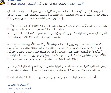 وروت علاء فى تدوينة عبر صفحتها على "فيس بوك" تفاصيل الحادث قائلة :" في يوم "الاثنين توجهت السجانة سيدة فاروق إلى عنبر البنات وأخذت تعتدي بالقول على الدكتورة سماح المعتقلة مع الطالبات (بسبب شفقتها على طلاب الأزهر وإعطائهم بعض الطعام فاعتقلت هي وزوجها)، ولما زاد حد السبّ .. ردت الدكتورة سماح على السجانة قائلة: "احترمي نفسك" .. فقامت السجانة بصفع د. سماح على وجهها !!".