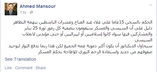 قال الإعلامى أحمد منصور ،إن الحكم بالسجن 15عامًا علي علاء عبد الفتاح وعشرات الناشطين بتهمة التظاهر دليل على أن السيسى والعسكر سيقومون بتصفية كل رموز ثورة 25 يناير والمشاركين فيها سواء كانوا إسلاميين أو ليبراليين أو حتى مؤيدين لانقلاب السيسى" .