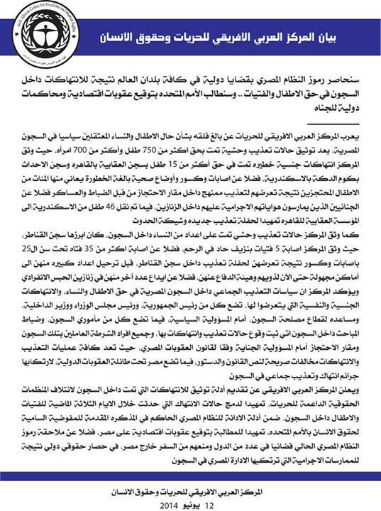 وفي سياق آخر أعرب المركز العربي الأفريقي للحريات عن بالغ قلقه بشأن حال الاطفال والنساء المعتقلين سياسيا في السجون المصرية، بعد توثيق حالات تعذيب وحشية تمت بحق أكثر من 750 طفل وأكثر من 700 امرأه؛ حيث وثق المركز انتهاكات جنسية خطيرة تمت في حق أكثر من 15 طفل بسجن العقابية بالقاهرة وسجن الأحداث بكوم الدكة بالاسكندرية، فضلا عن إصابات وكسور وأوضاع صحية بالغة الخطورة يعاني منها المئات من الأطفال المحتجزين نتيجة تعرضهم لتعذيب ممنهج داخل مقار الاحتجاز من قبل الضباط والعساكر، فضلا عن الجنائيين الذين يمارسون هواياتهم الاجرامية عليهم داخل الزنازين، فيما تم نقل 46 طفل من الإسكندرية إلى المؤسسة العقابية بالقاهرة؛ تمهيدا لحفلة تعذيب جديدة وشيكة الحدوث.
