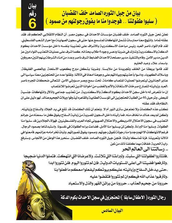 وأضاف الأطفال: "إن ما نتعرض له داخل سجن الاحداث بكوم الدكة بالاسكندرية، من تعذيب جماعي وإذلال وانتهاكات جنسية للبعض، وتم ترحيل 46 من الطلبة المحتجزين الى المؤسسة العقابية بالقاهره ليذوقوا ويلات الجحيم هناك، لهو دليل على أن النظام قد فقد عقله."