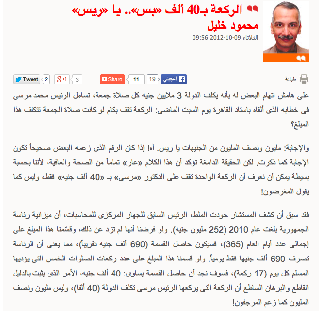 ولو افترضنا صحة افتراض الكاتب أن تكلفة الرئاسة في اليوم هو ٦٩٠ ألف جنيه، فكيف له أن يقسمها على عدد ركعات اليوم الـ١٧ عشر ليضع عنوان مقاله "ركعة الرئيس ب٤٠ ألف جنيه!!"