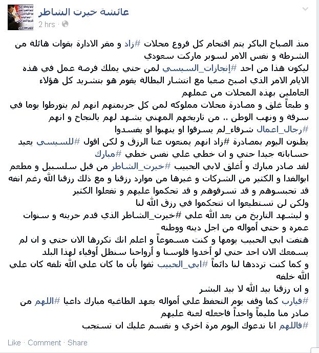 وأضافت عائشة فى تدوينة عبر صفحتها على "فيس بوك": "منذ الصباح الباكر يتم اقتحام كل فروع محلات ‫‏زاد و مقر الإدارة بقوات هائلة من الشرطة و نفس الأمر لسوبر ماركت سعودي ،ليكون هذا من أحد ‫‏إنجازات السيسي لمن حتي يملك فرصة عمل في هذه الأيام الأمر الذي أصبح صعبًا مع انتشار البطالة يقوم هو بتشريد كل هؤلاء العاملين بهذه المحلات من عملهم".