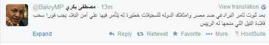 وشدد بكرى عبر حسابه الرسمي على "تويتر": "بعد ثبوت تآمر البرادعى ضد مصر، وامتلاك الدولة لتسجيلات خطيرة له يتآمر فيها على أمن البلاد يجب فورا سحب قلادة النيل التى منحها له الرئيس".