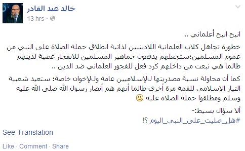 وأضاف سعيد فى تدوينة له عبر صفحته الشخصية على موقع التواصل الاجتماعي "فيس بوك": أن "محاولة نسبة مصدرها لإسلاميين عامة وللإخوان خاصة؛ ستعيد شعبية التيار اﻹسلامي للقمة مرة أخرى؛ طالما أنهم هم أنصار رسول الله صلى الله عليه وسلم ومطلقو حملة الصلاة عليه".