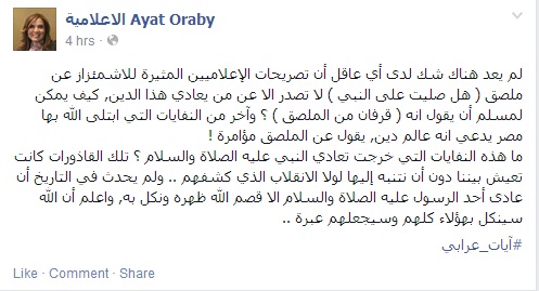 قالت الإعلامية آيات العرابى أنه لم يعد هناك شك لدى أي عاقل أن تصريحات الإعلاميين المثيرة للاشمئزاز عن ملصق ( هل صليت على النبي ) لا تصدر إلا عن من يعادي هذا الدين.