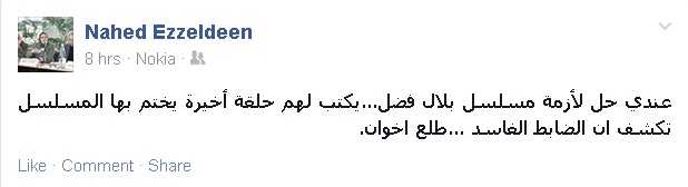 ونصحت عز الدين الكاتب بلال فضل فى تدوينة عبر صفحتها على "فيس بوك" بتغيير نهاية المسلسل حتى يتم عرضه قائلة: "عندي حل لأزمة مسلسل بلال فضل…يكتب لهم حلقة أخيرة يختم بها المسلسل تكشف إن الضابط الفاسد …طلع إخوان".