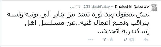 وقال النبوى في تغريدة له عبر موقع "تويتر"، مساء الأحد: "مش معقول بعد ثورة تمتد من يناير إلى يونيو ولسه بنراقب ونمنع أعمال فنيه..عن مسلسل أهل إسكندرية أتحدث".