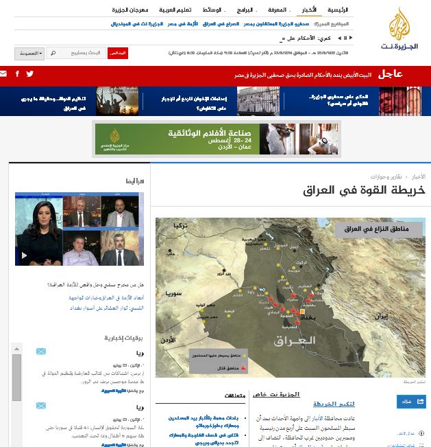 وقالت قناة الجزيرة في تقريرها المفصل حول المحافظات التي سيطر عليها الثوار السنة واو التي على وشك السيطرة عليها:"عادت محافظة الأنبار إلى واجهة الأحداث بعد أن سيطر المسلحون السبت على أربع مدن رئيسية ومعبرين حدوديين غرب المحافظة، لتضاف إلى مساحات واسعة من العراق أصبحت خارج سيطرة الدولة، فضلا عن مساحات أخرى في وسط البلاد تشهد مواجهات مسلحة عنيفة".