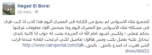 وقال البرعى فى تدوينة عبر "فيس بوك": للجميع علاء الأسواني لم يمنع من الكتابه في المصري اليوم هذا كذب أنا كنت طرف في مشكله علاء الاسواني مع المصري اليوم وما يصحش أقول معلومات عرفتها بحكم عملي ؛ ولكنني اشهد أمام الله أن الجريدة بعثت له جواب أنا كاتبه بايدي تتحايل عليه يفضل يكتب ومش هاقول تفاصيل لكني انزعجت للغاية عندما قرئت الخبر فقررت أن أصدع بالحق".