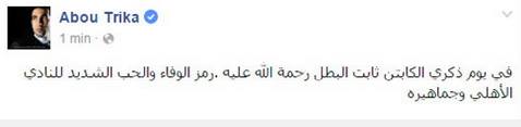 حرص محمد أبو تريكة، لاعب الأهلي المعتزل، على إحياء ذكرى وفاة ثابت البطل، مدير الكرة السابق بالأهلي.