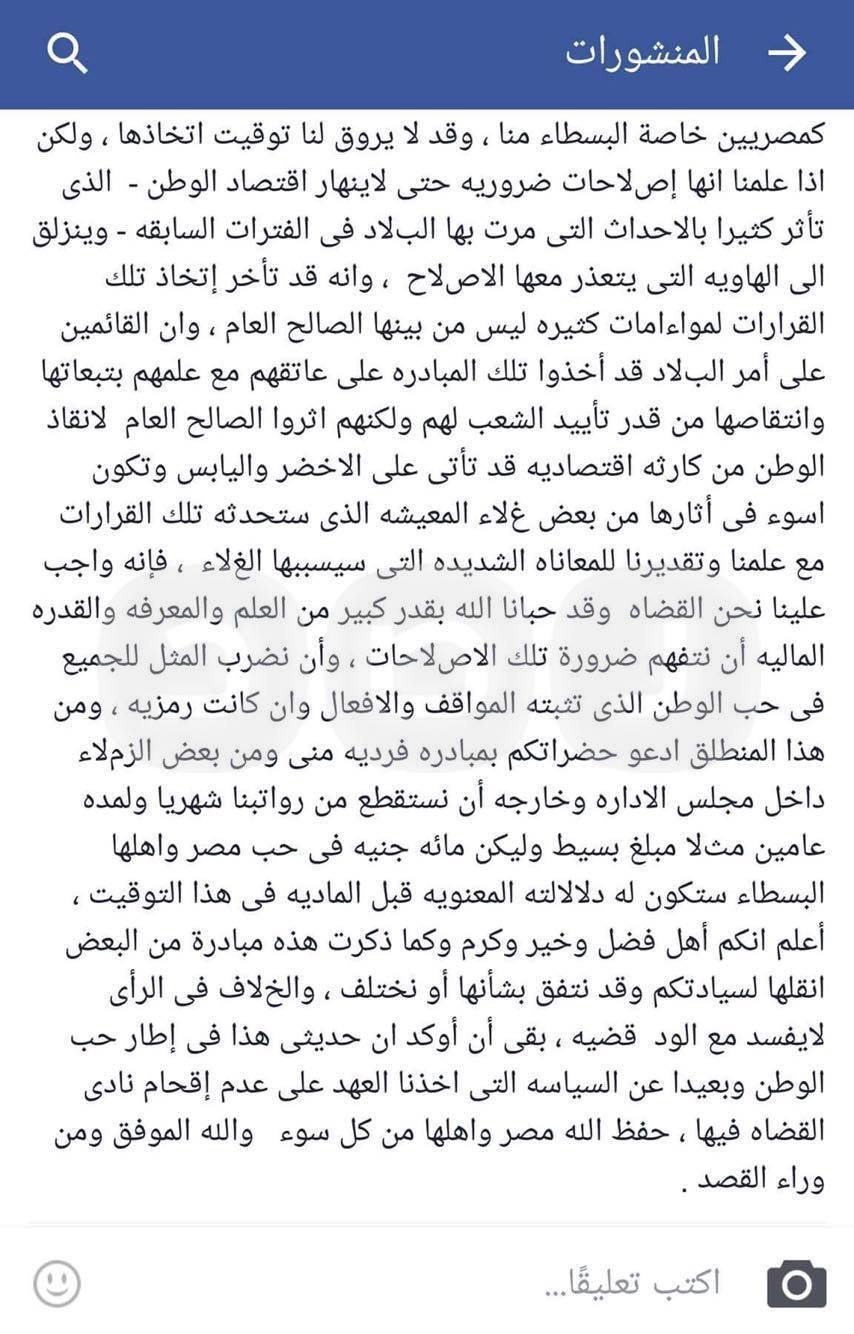 حصلت شبكة “رصد”، على تسريب من داخل صفحة خاصة للقضاة على موقع التواصل الاجتماعي “فيس بوك”، تحمل اسم “الجروب الرسمي لنادي القضاة”، نشر فيها المستشار محمد عبد المحسن منصور نائب رئيس محكمة النقض، منشور أعرب فيه عن عدم رضاه التام للقرارت الاقتصادية التي اتخذها السيسي وحكومة شريف إسماعيل، معتبرًا أن تلك القرارات تزيد من معاناة البسطاء.
